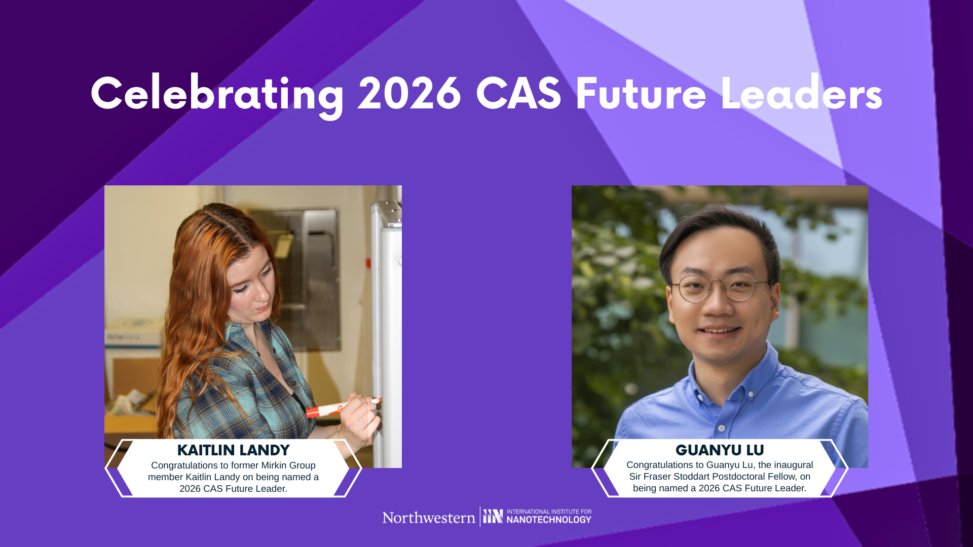 Guanyu Lu, the inaugural IIN Sir Fraser Stoddart Postdoctoral Fellow and Kaitlin Landy, former IIN Ryan Fellow and Mirkin Group Member, have been named 2026 CAS Future Leaders.